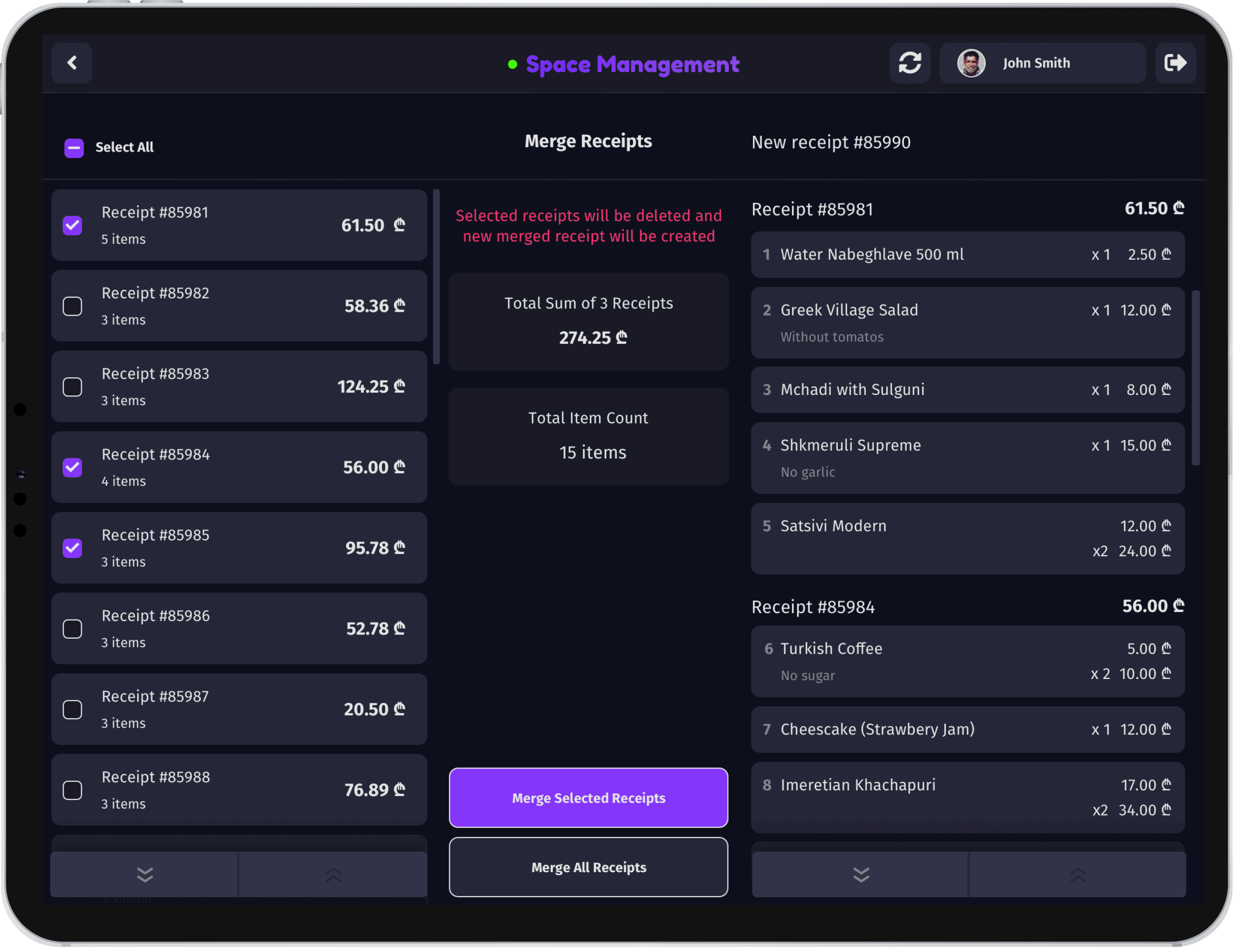 SpaceM is a restaurant POS that pioneered dynamic receipt merging in Georgia.